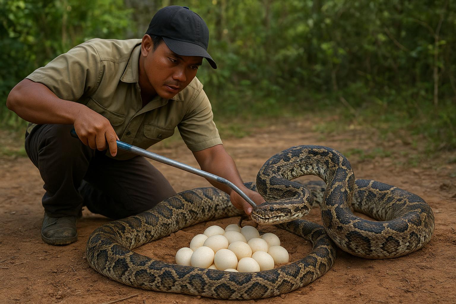 The handler confirms there are twenty-seven healthy eggs recovered from the defensive mother snake.